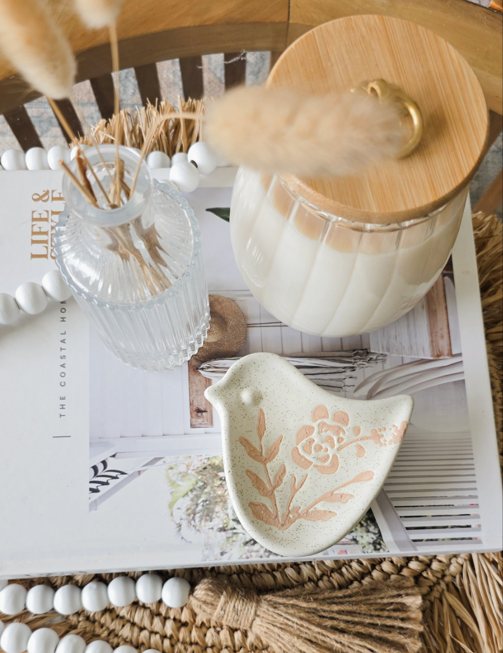 How cute is this sweet, little bird dish! Each one has been crafted by hand, hand-painted and glazed with a soft floral design, which means each piece is uniquely different.