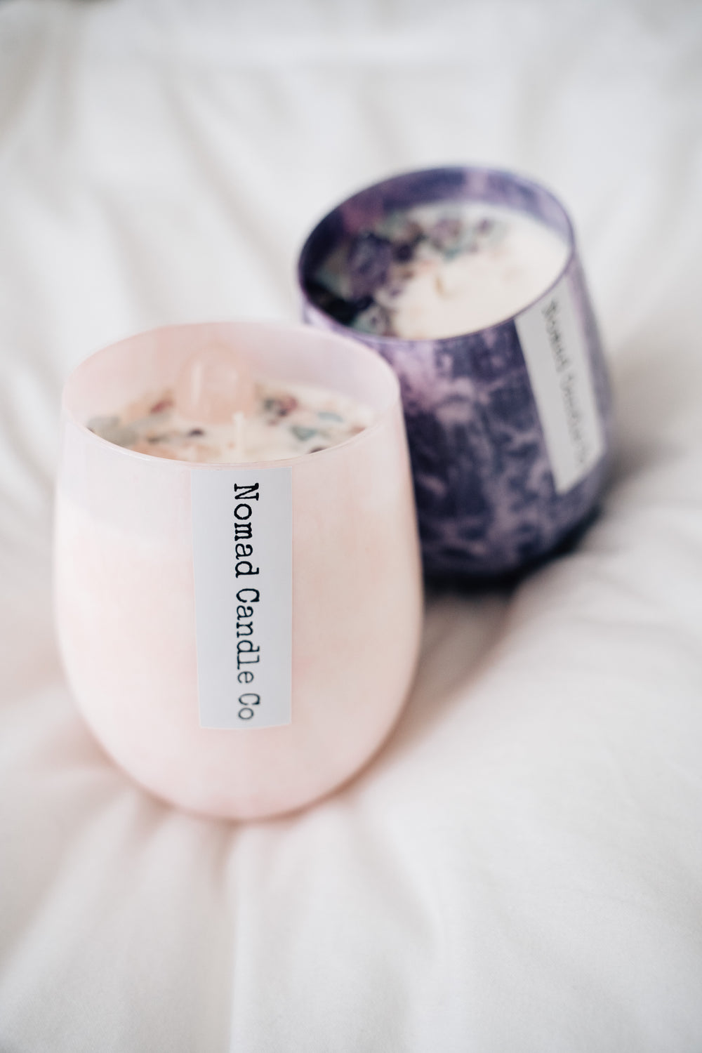 The Nomad Candle Co. Crystal Collection is a thoughtful gift with a spiritual difference. Each candle is uniquely handcrafted with Rose Quartz crystals and scattered gemstones.